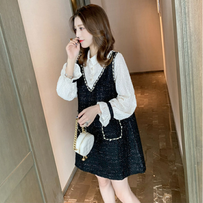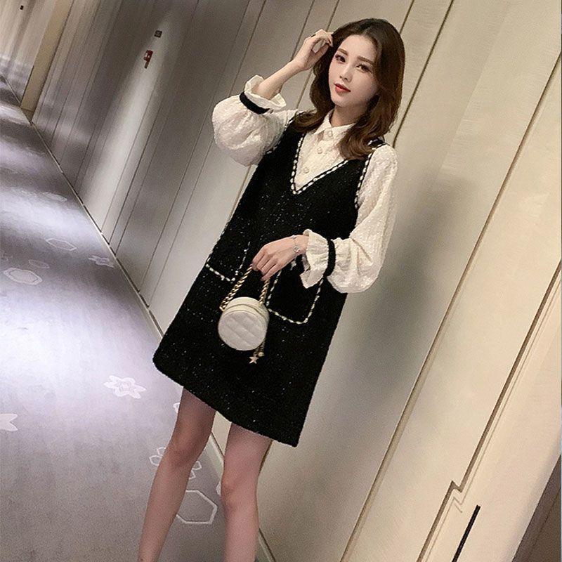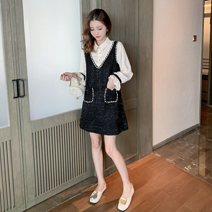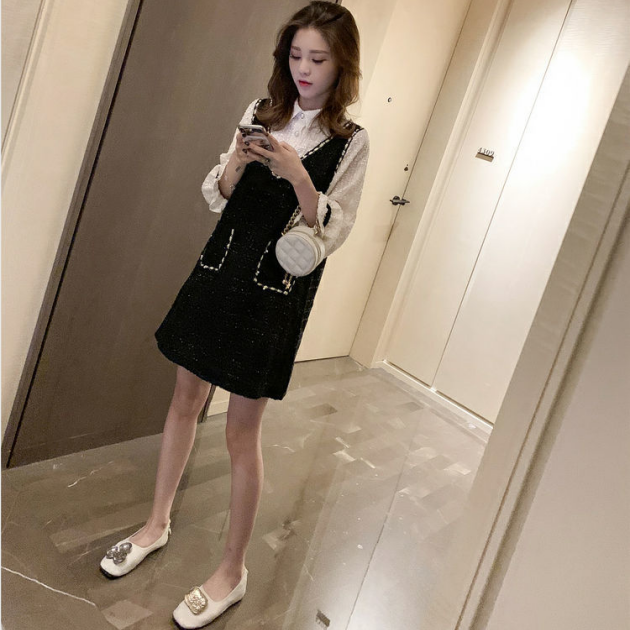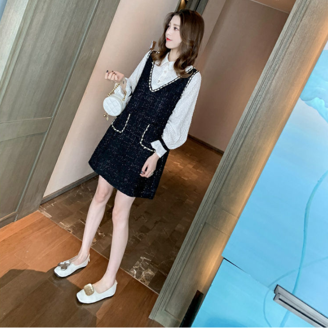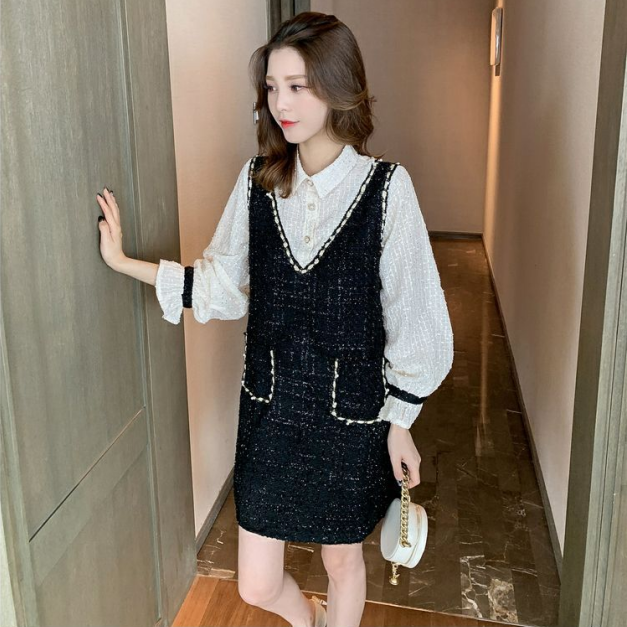 【Set】新入荷~大人可愛いレイヤード2点セット シャツ + ツイード調ノースリーブワンピース Z-4513