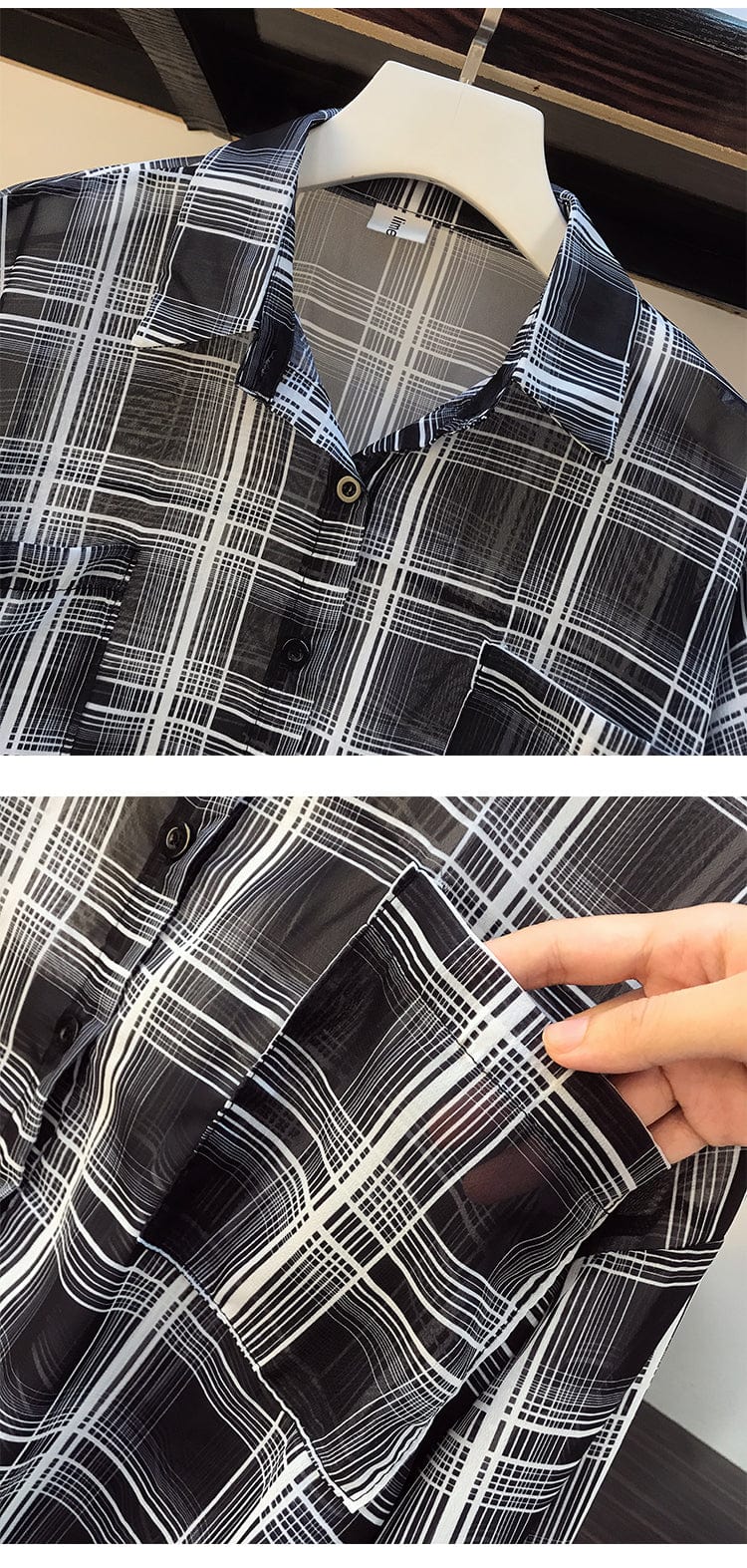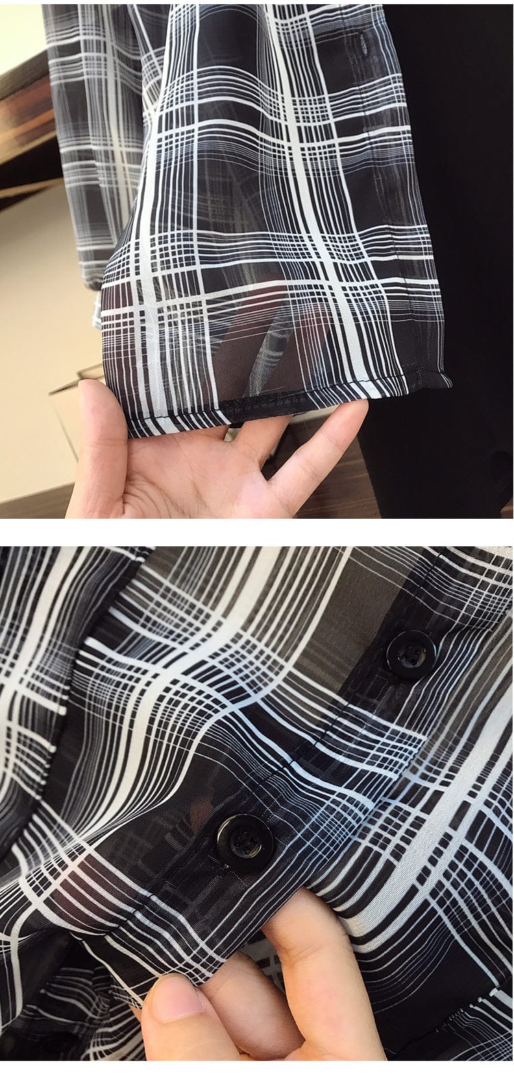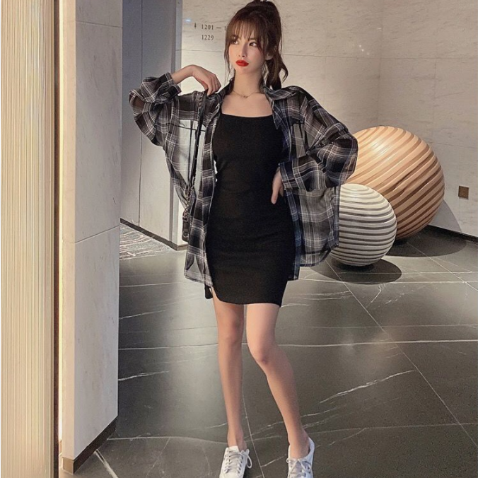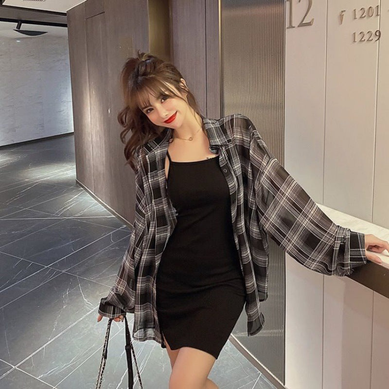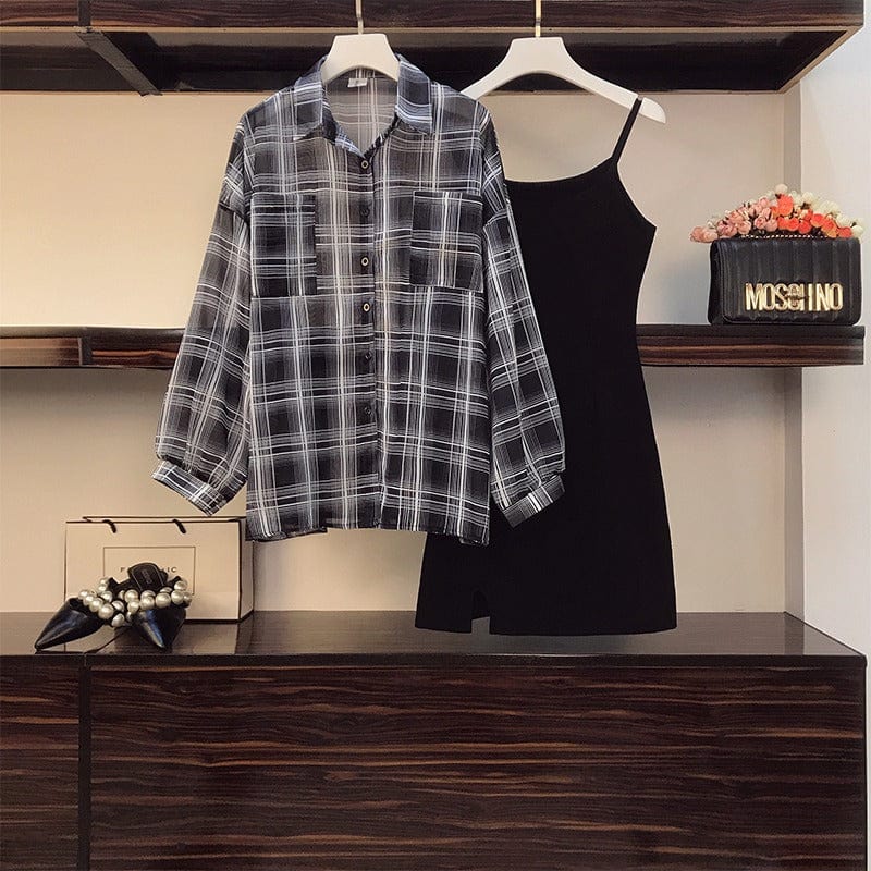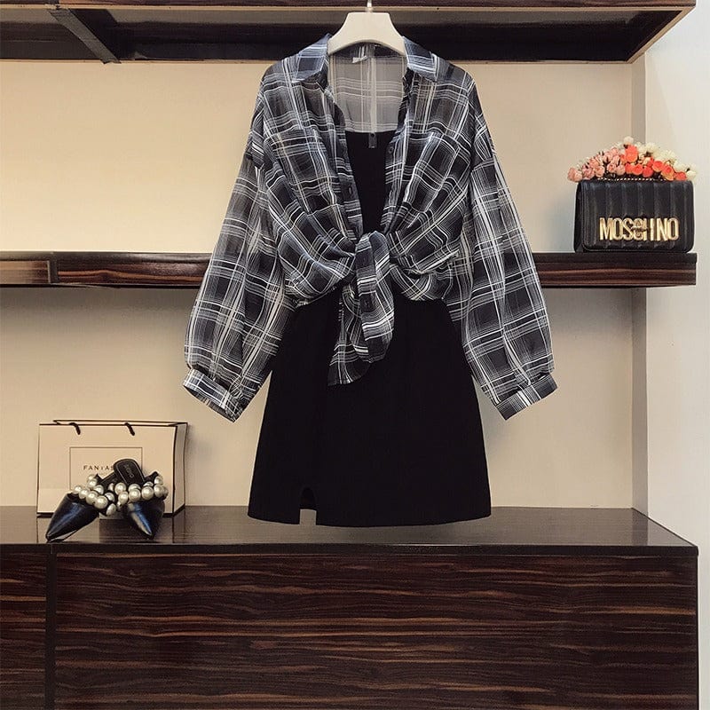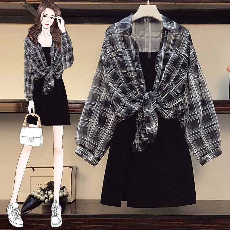 【Set】チェック柄シャツ + キャミワンピース重ね着2点セット Z-2403