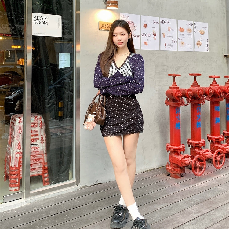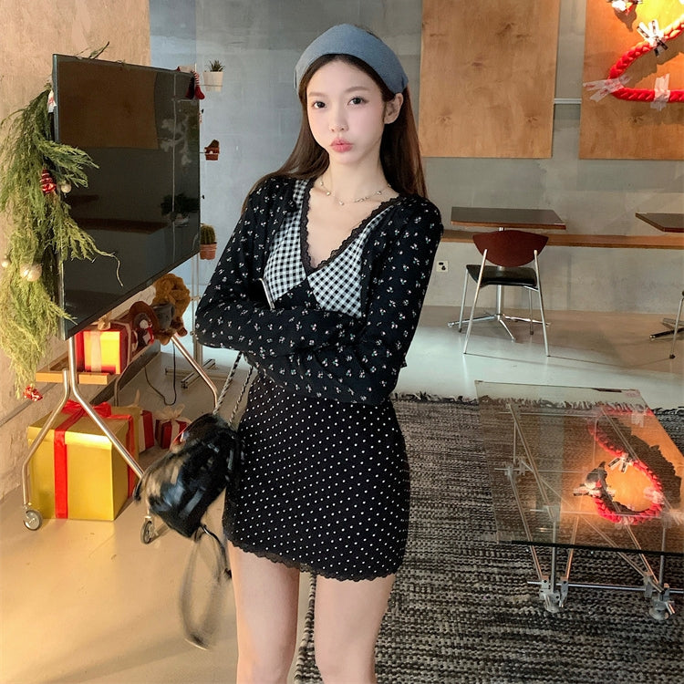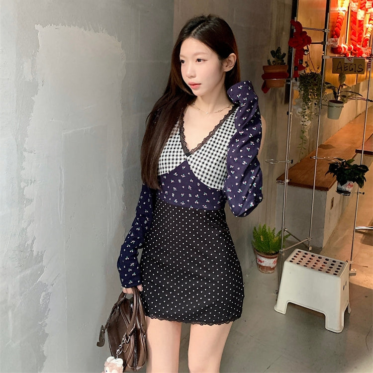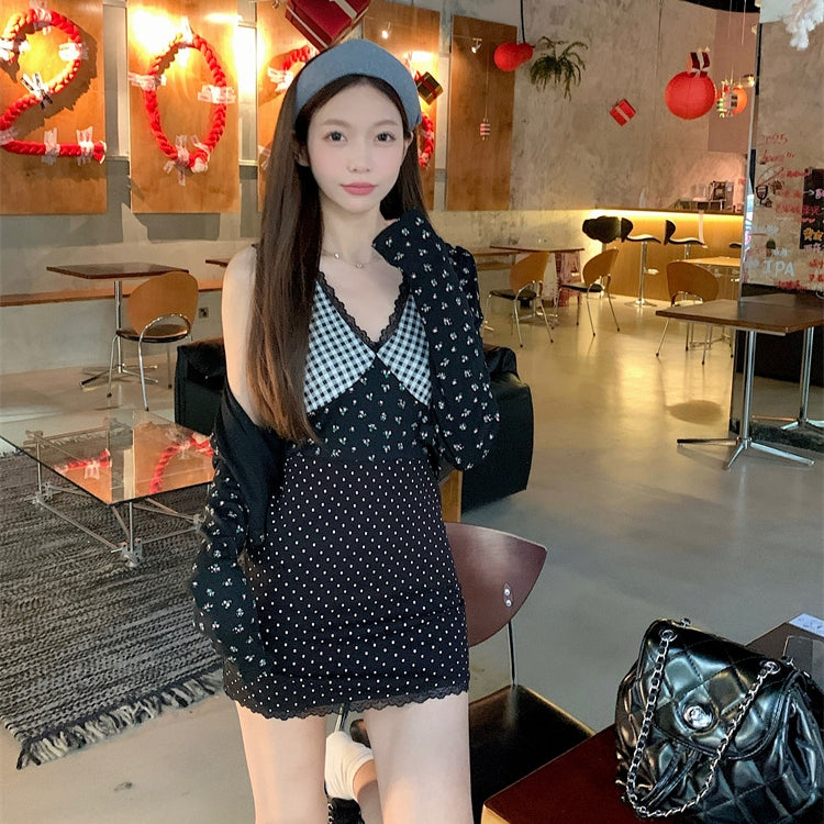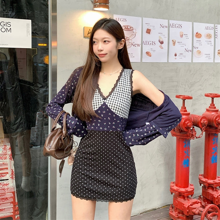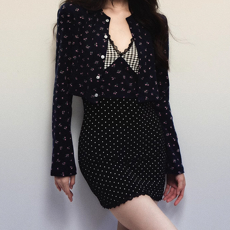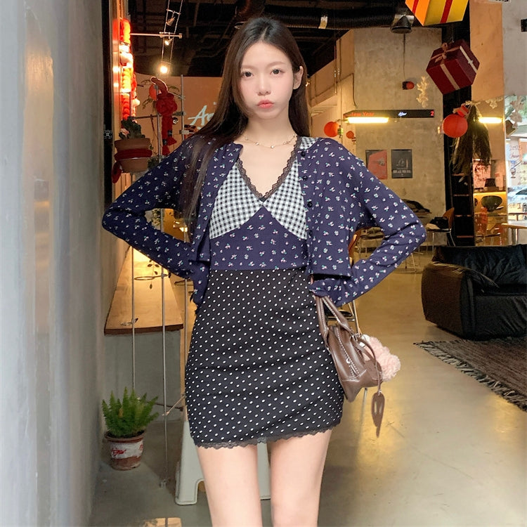 【Set】花柄カーディガン+切り替えワンピース2点セット T01360