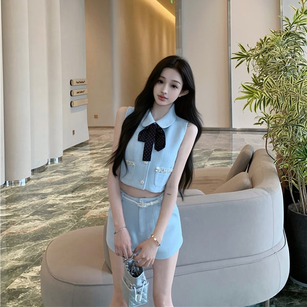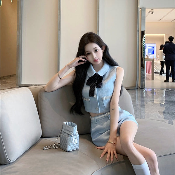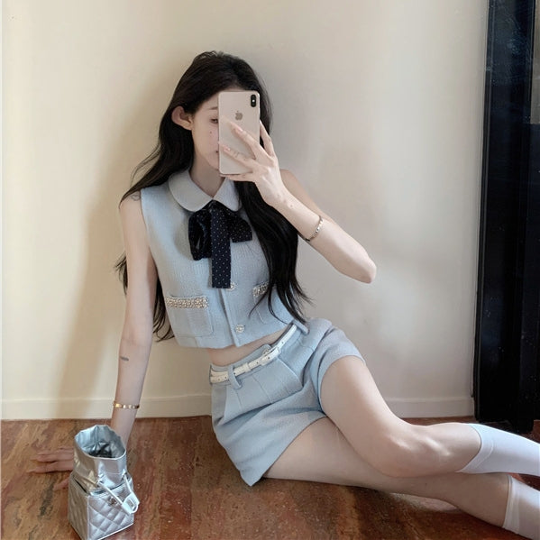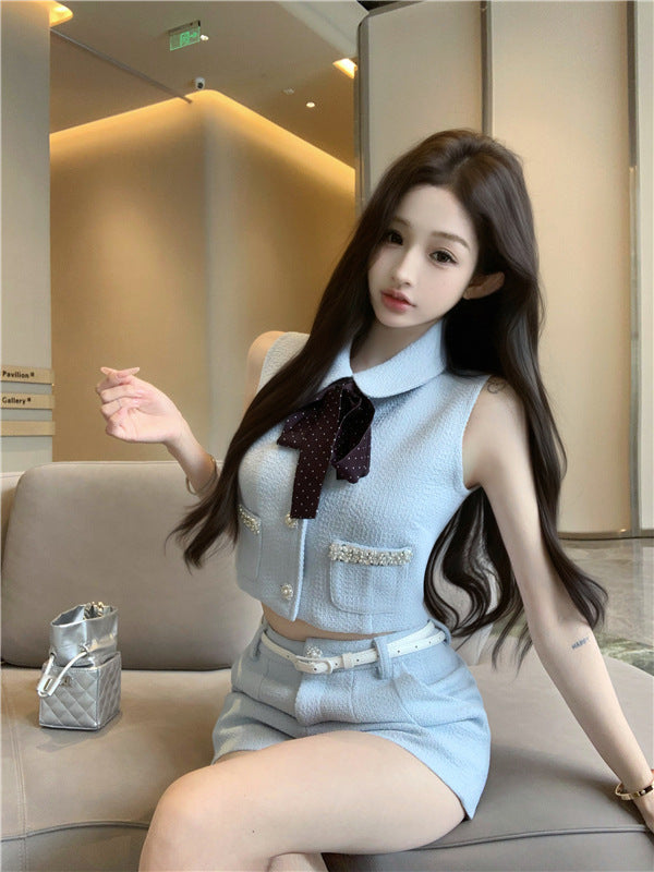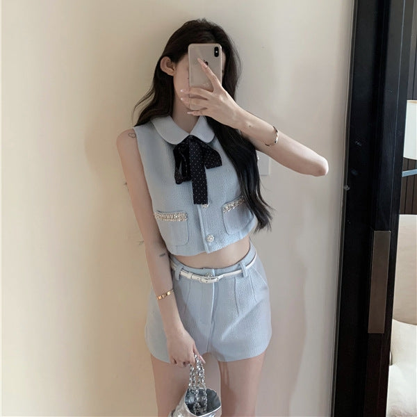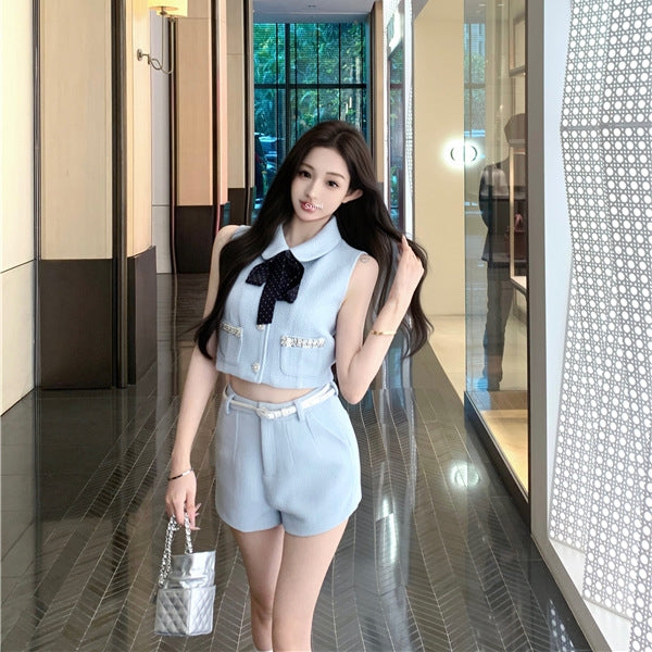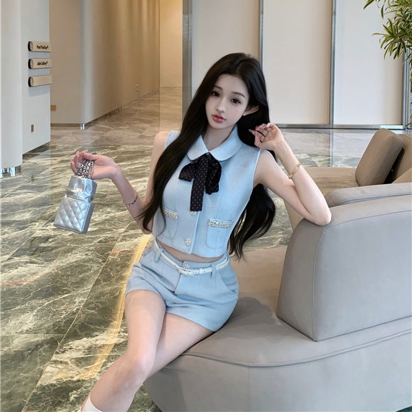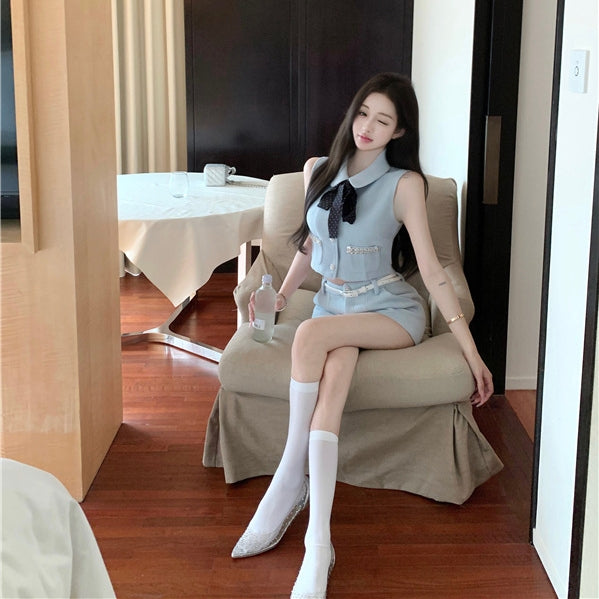 【Set】リボン付きノースリーブトップス×ベルト付きショートパンツセット T01388