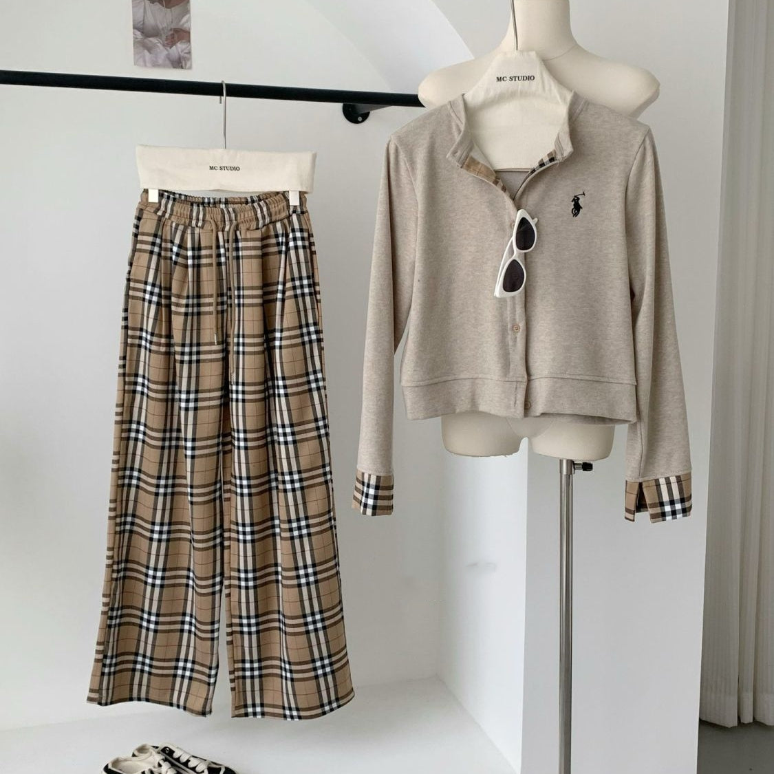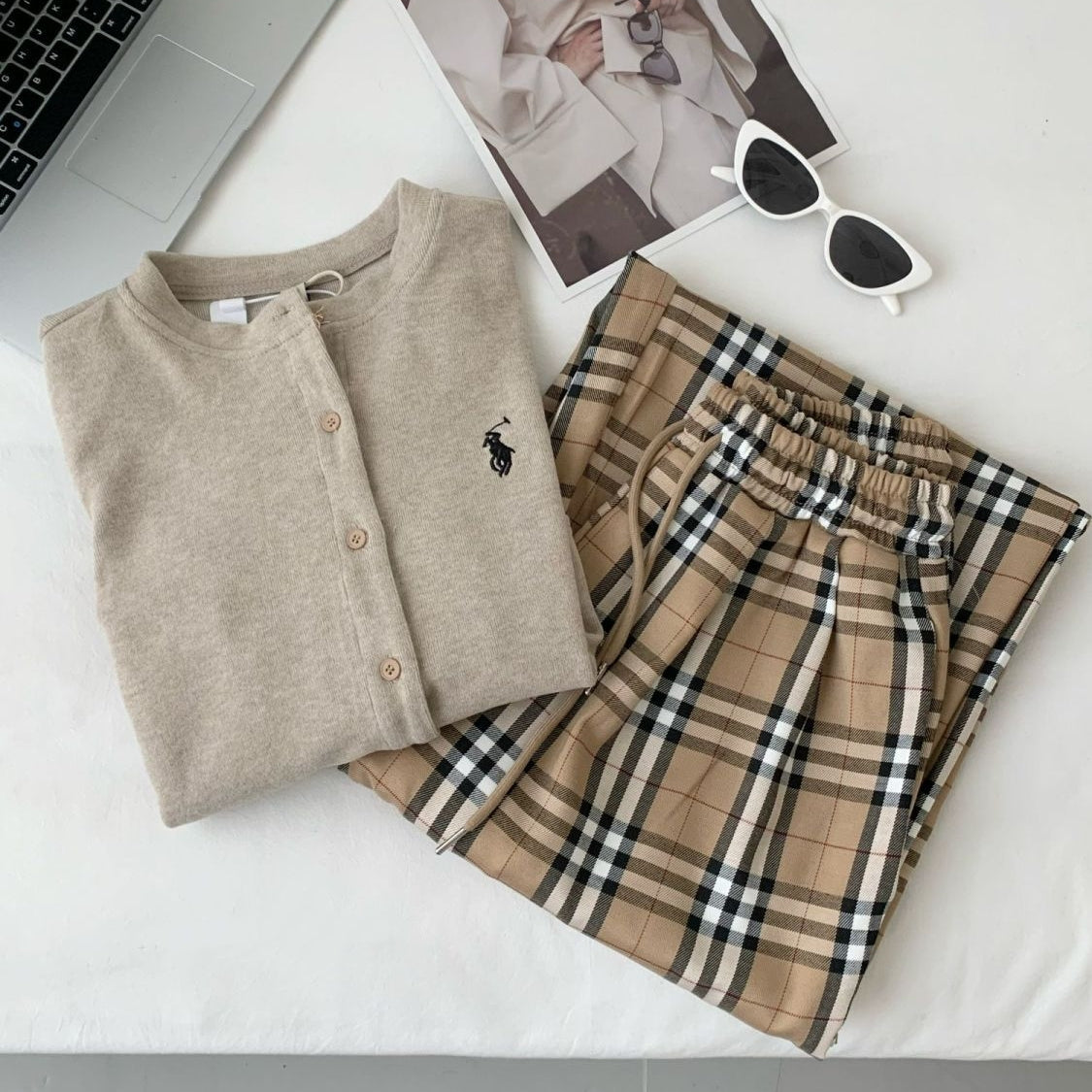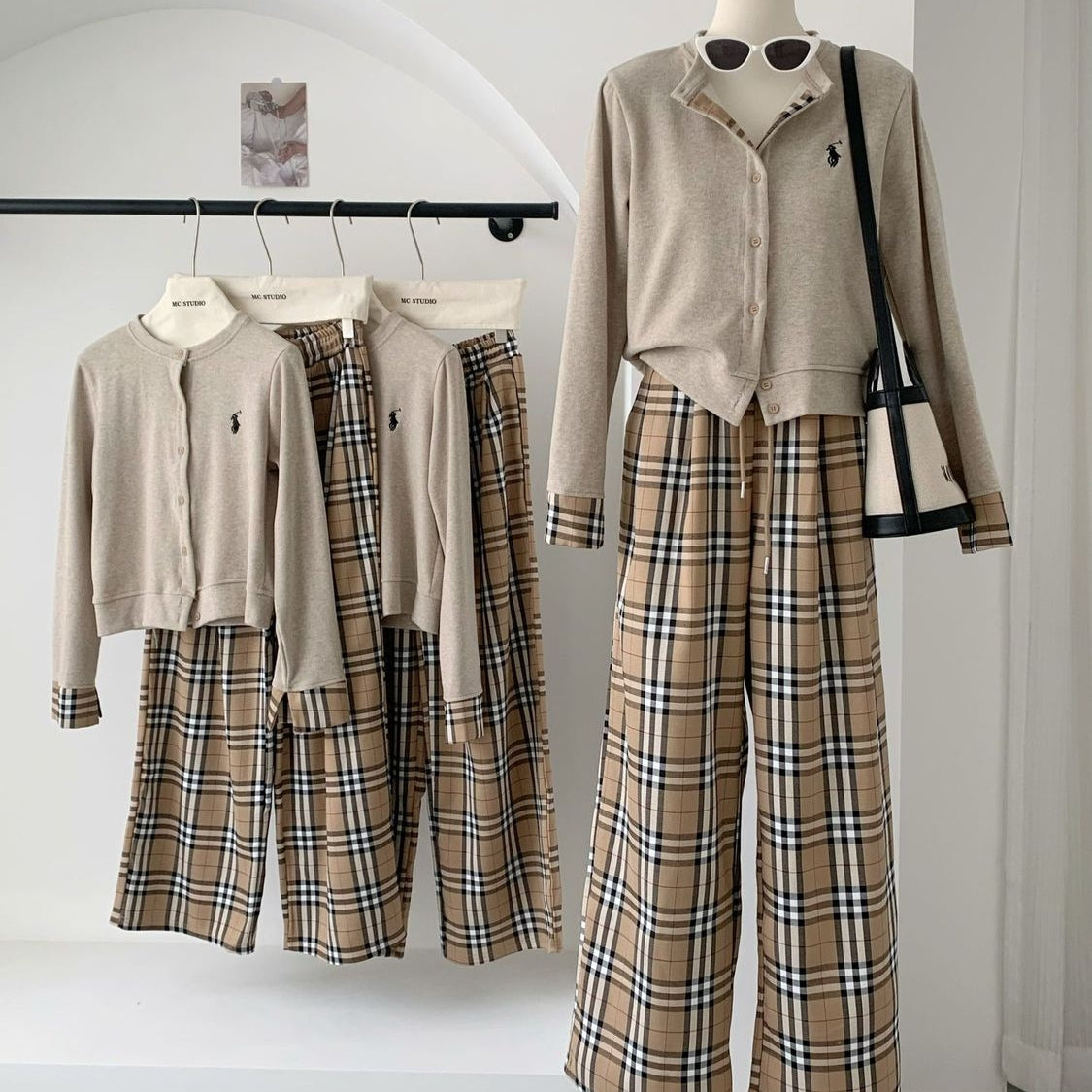 【Set】カーディガン+チェック柄パンツ2点セット T01431