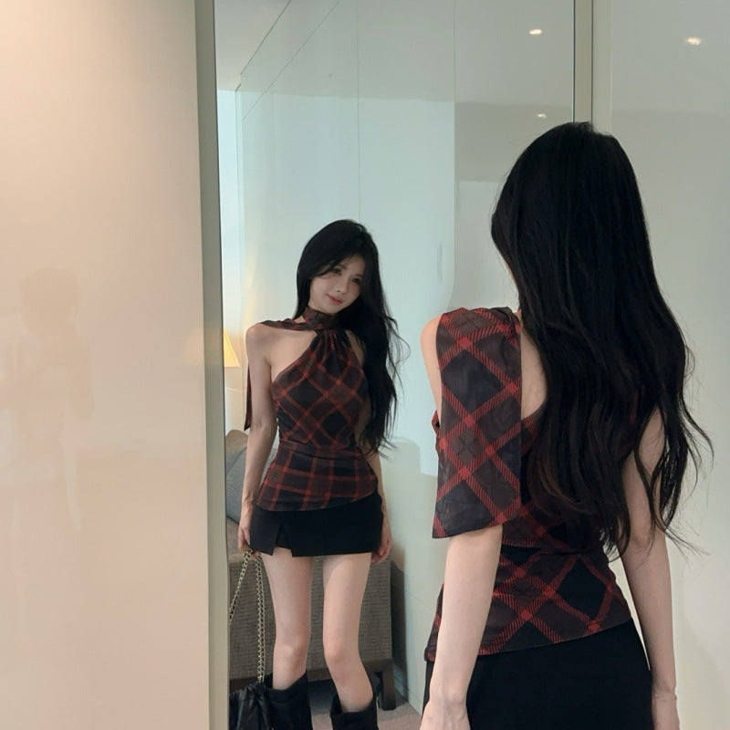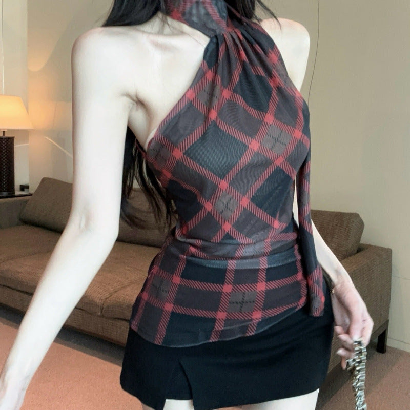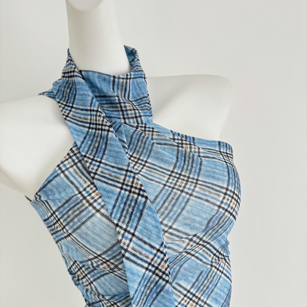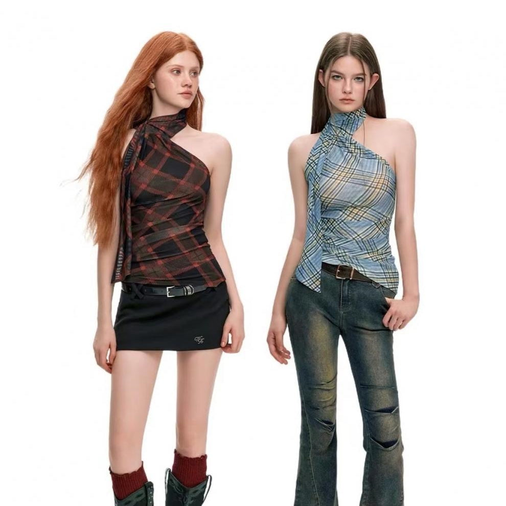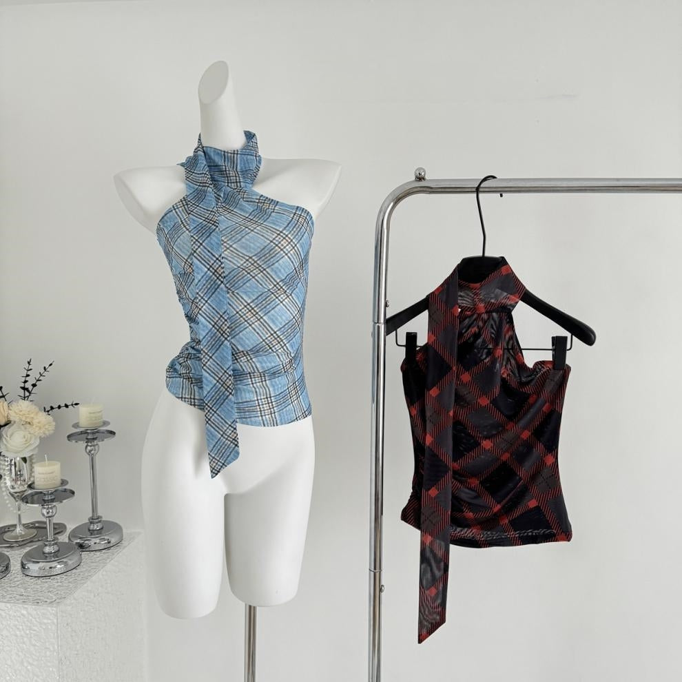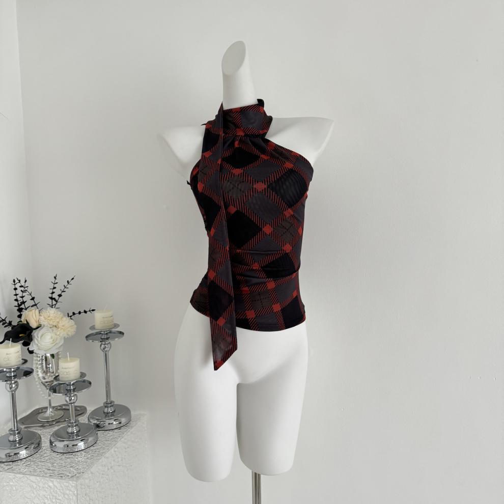 【Tops】チェック柄リボンネックホルダーベスト T01758